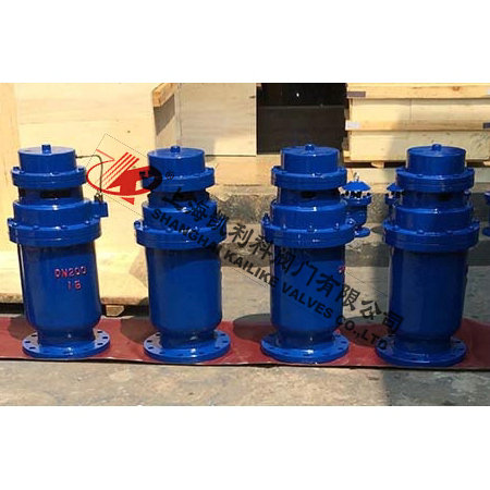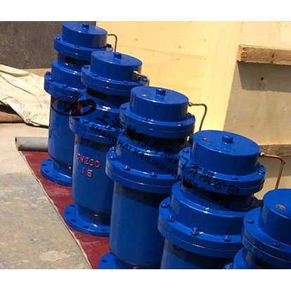 QSP全壓高速排氣閥由下閥體,中閥體,浮筒,浮筒桿,閥芯,蓋板,活塞桿,膜片及閥蓋等組成的全壓高速排氣閥,其特征是通過銷軸與浮筒鉸接的浮筒桿可繞主軸轉(zhuǎn)動,并由此實現(xiàn)通過浮筒升降控制閥芯的升降啟閉,即當浮筒下降(閥體里充滿氣體)時,閥芯上升,打開小閥口,并關閉小排氣帽上的排氣口,使氣體通過導管進入液壓罐內(nèi),當浮筒在浮力作用下上升時候,閥芯下降,關閉小閥口,同時打開排氣帽上的排氣口,使液壓罐通過導管,直通大氣泄壓,且當浮筒下降,液壓缸內(nèi)充滿氣體時,閥門上的大排氣口自動關閉。當水泵停止,管內(nèi)水流空時或遇到管內(nèi)產(chǎn)生負壓時,吸入空氣,確保管線安全。